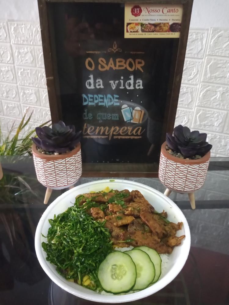 Acompanha: Arroz, feijão preto, macarrão e farofa.